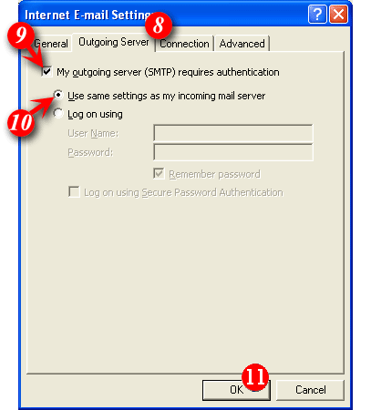 | 15)Enter your 'email address and password'. (By default Outlook will enter part of your e-mail address as the User Name. Delete this information and enter your 'email address' (for example: me@mydomain.com). | ||||