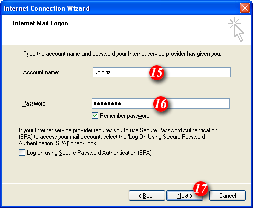 | 15) By default Outlook Express will put part of your email address as the username. Delete this information and enter your email address. (example: me@mydomain.com) | |||||